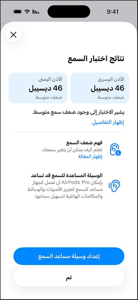 نتائج فورية. دعم سلس. بعد انتهائك من الاختبار، تحصل على ملف شخصي يتضمن نتائج ومعلومات سهلة الفهم عن سمعك. وفي حال تبيّن أنك تعاني من ضعف سمع خفيف أو أن سمعك طبيعي ولكنك تريد سماع بعض الترددات بشكل أوضح، تستطيع ضبط إعدادات "مساعد السمع" لتحصل على صوت معزز أثناء المكالمات وعند استماعك إلى أي محتوى. أما إن تبيّن أنك تعاني من فقدان سمع خفيف إلى متوسط، فسيُطلب منك إعداد وسيلة مساعدة السمع.