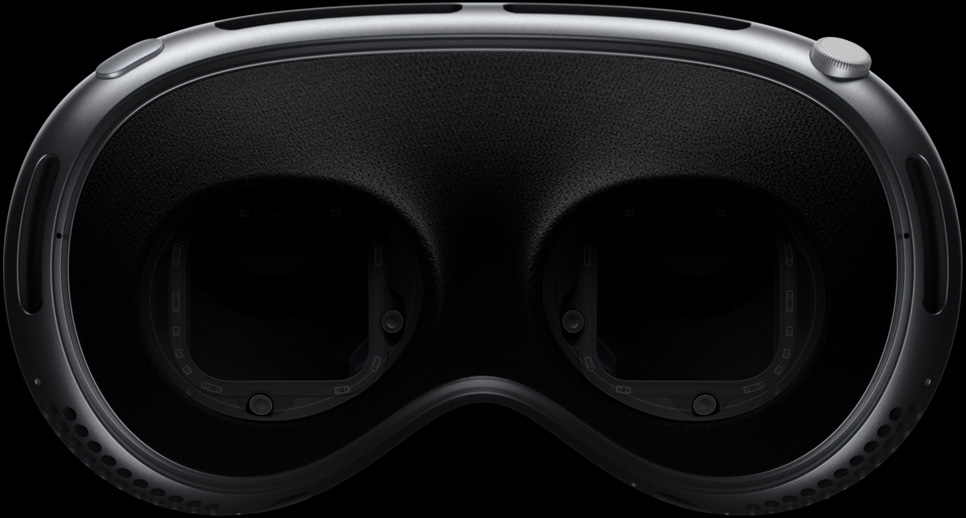 صورة للجانب الداخلي من Apple Vision Pro تبيّن وحدات الإضاءة LED والكاميرات التي تعمل بالأشعة تحت الحمراء وتتيح تتبّع العينين بدقة