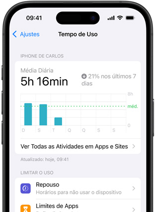 O Tempo de Uso é um recurso que ajuda a entender quanto tempo você e seus filhos passam acessando apps, visitando sites e usando seus aparelhos. Você pode consultar relatórios semanais ou verificar o uso de um app específico, receber notificações e saber quantas vezes pegou o aparelho.