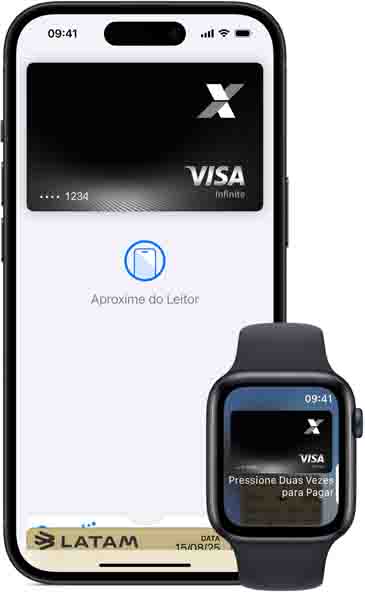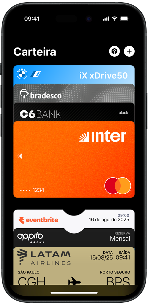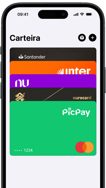você guarda com segurança seus cartões de crédito, débito, vales-alimentação, cartões de embarque, ingressos e muito mais. Tudo em um só lugar. E tudo funcionando com o iPhone ou o Apple Watch, para você carregar menos e ter o que precisa por onde for.