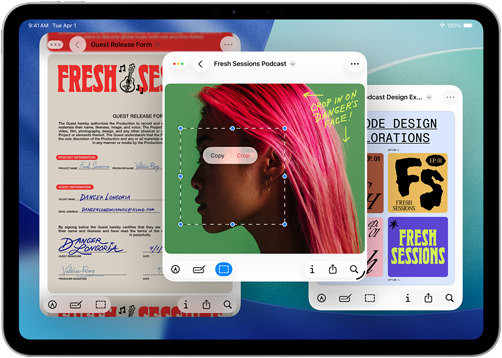 iPad, tři modely, orientace na šířku, prostřední model je umístěný před dalšími dvěma, Apple Pencil magneticky připnutý k horní straně prostředního modelu, na prostřední obrazovce je zobrazená plocha s barevnými ikonami aplikací s efektem Liquid Glass, na levé obrazovce je otevřená aplikace Náhled, na pravé obrazovce je plocha se soubory rozbalenými z Docku do vějíře