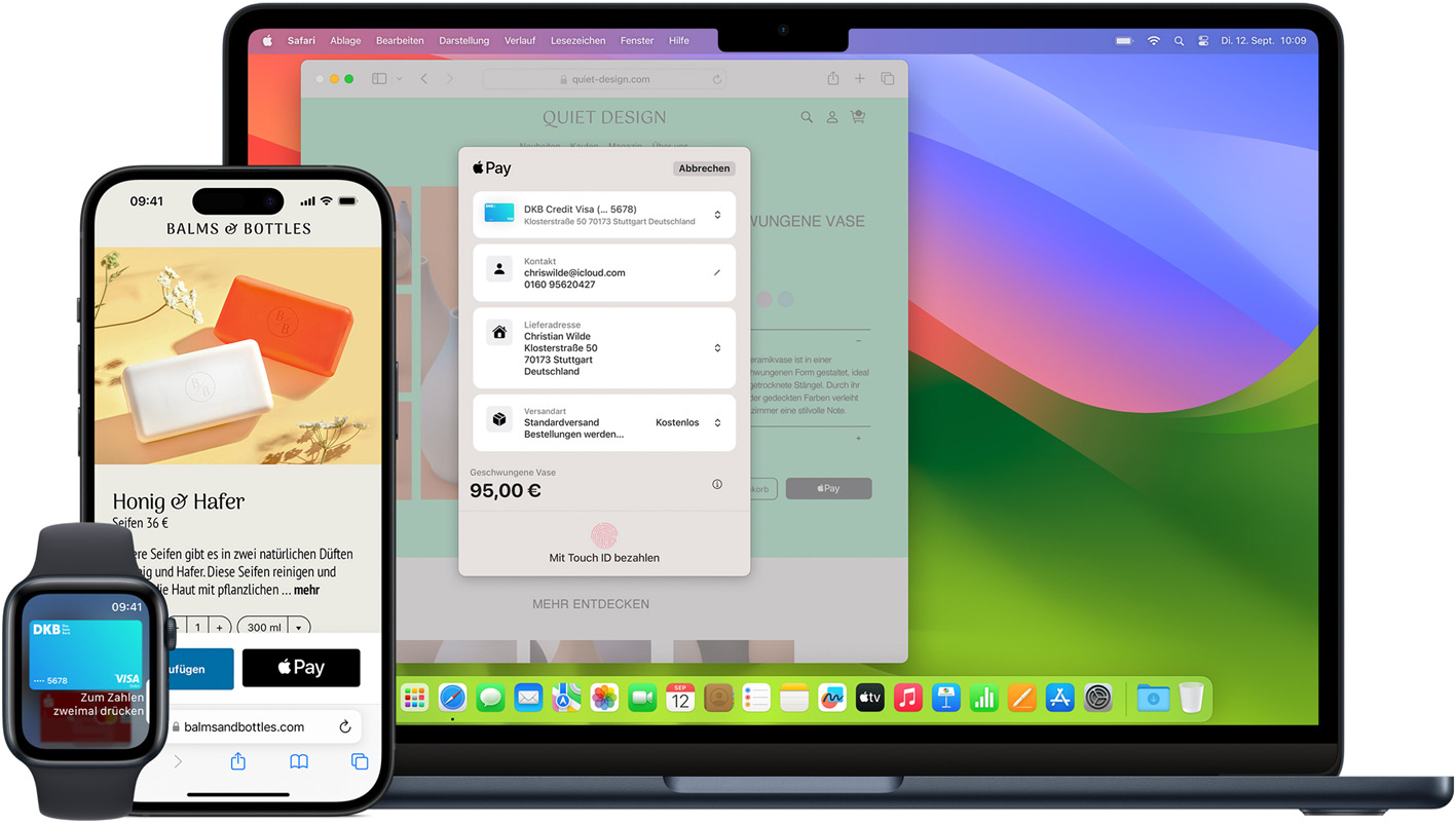 So fügst du eine Karte hinzuApple Pay ist bereits auf deinem Gerät. Apple Pay ist in deinem iPhone, Mac, iPad, deiner Apple Watch und Apple Vision Pro integriert. Kein kompliziertes Einrichten. Keine separate App zum Laden. Keine Probleme.