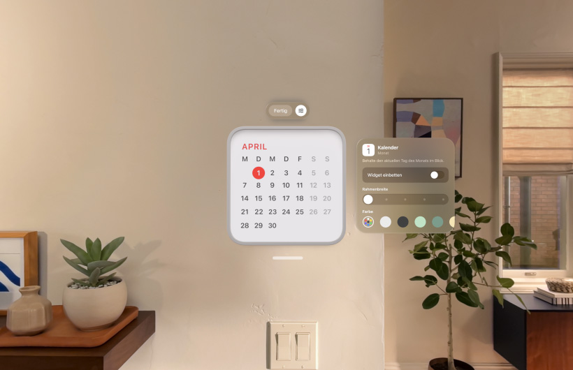 In visionOS befinden sich Apps im Raum um dich herum – weit über die Grenzen eines Displays hinaus. Sie lassen sich frei bewegen, passen sich perfekt in der Größe an, reagieren auf die Beleuchtung im Raum und werfen sogar Schatten.