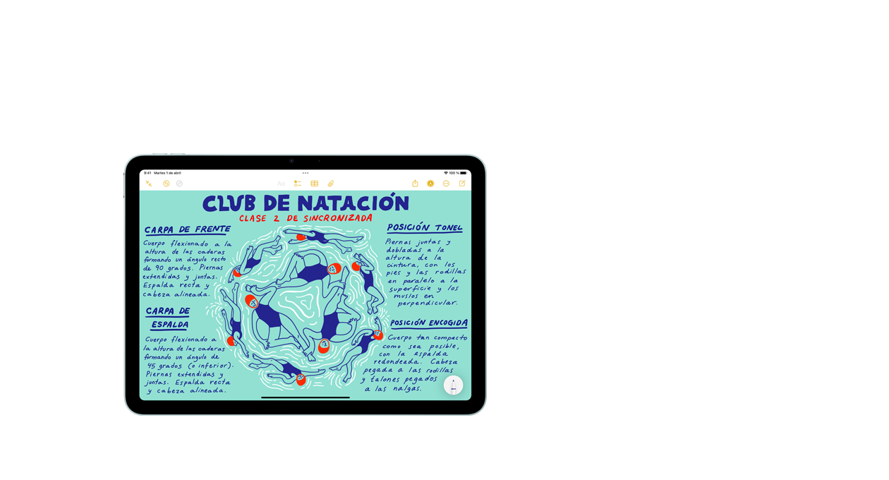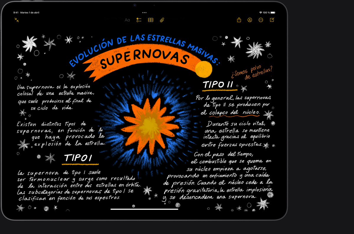 El Apple Pencil se ha convertido en un referente a la hora de dibujar, pintar, escribir y tomar notas. Cada gesto es intuitivo, preciso y casi mágico. Su trazo es inmediato, su precisión es milimétrica, detecta la inclinación y no pasa nada si apoyas la mano en la pantalla. Y con el Apple Pencil Pro tienes aún más funciones para hacer despuntar tu talento3