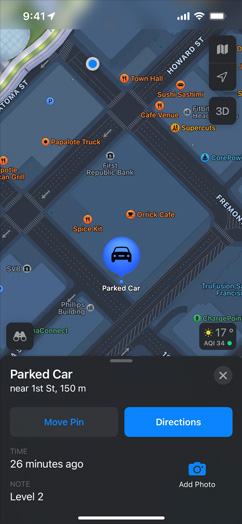 Maps doesn’t associate your data with your Apple Account, and Apple doesn’t keep a history of where you’ve been. Many personalized features, like locating your parked car, are initiated right on your device. Data used to improve navigation, such as routes and search terms, is not associated with your identity. Instead, that information is based on random identifiers that are constantly changing.