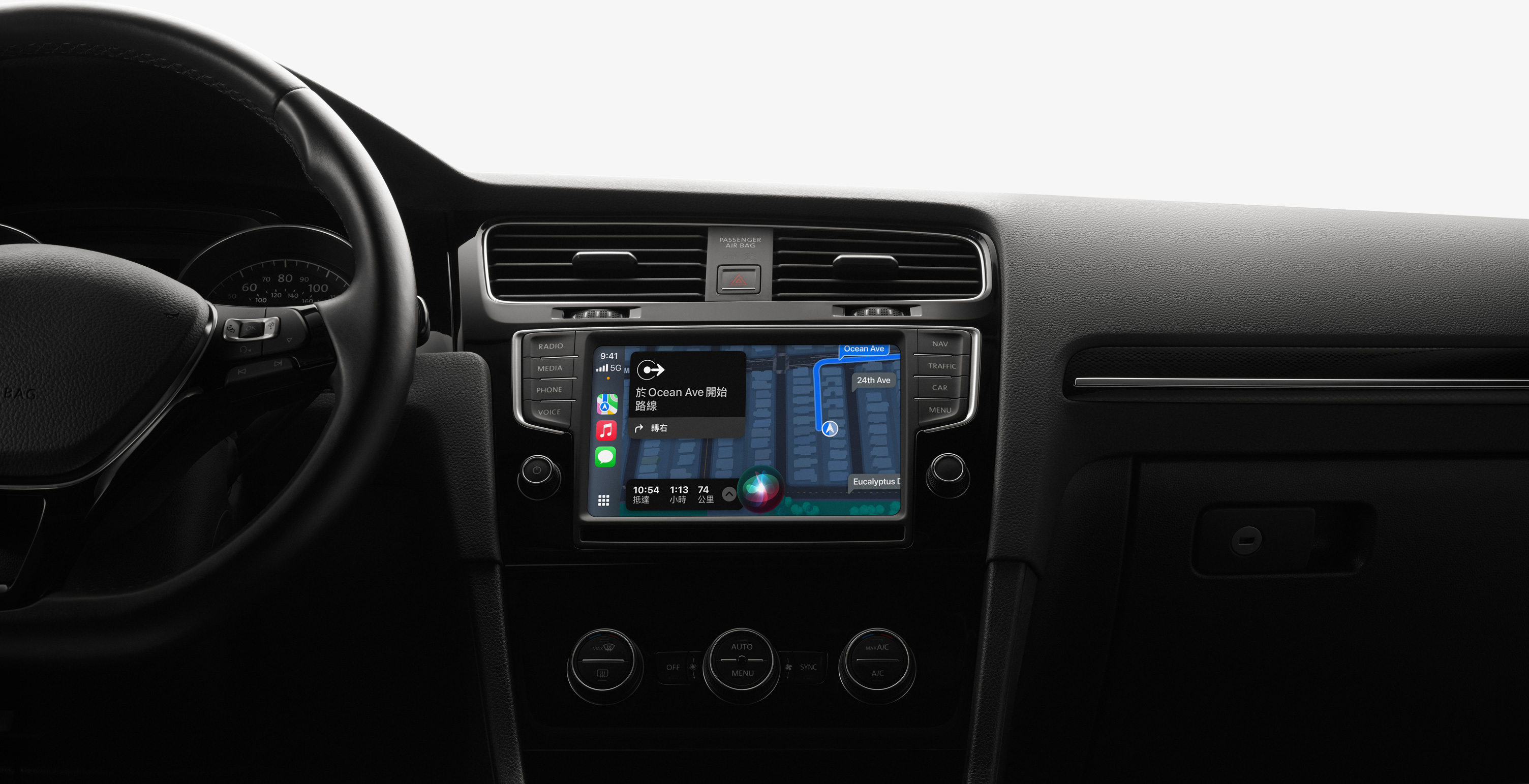 有 Siri,行車更安全。駕駛時專心睇路,使用軚盤上備有 CarPlay1 功能的按鈕或直接開句聲,即可取得路線指示、打電話和通知朋友你何時到達。
