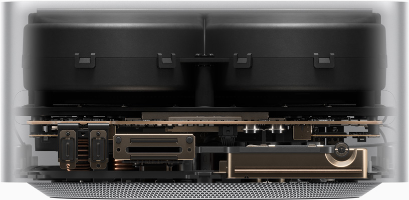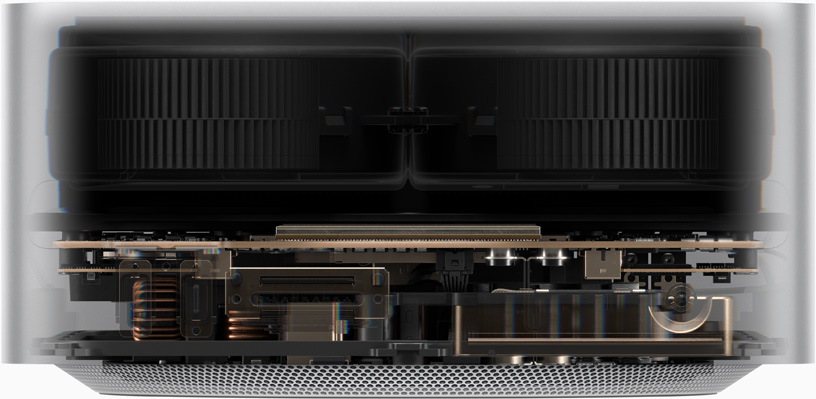 U kvadratno kućište računala Mac Studio veličine 19,7 cm ugrađen je termalni sustav koji čipovima M4 Max i M3 Ultra omogućuje obavljanje zahtjevnih radnih zadataka munjevitom brzinom. No čak i uz svoju nevjerojatnu snagu, Mac Studio ostaje tih i nikada te ne ometa u radu.