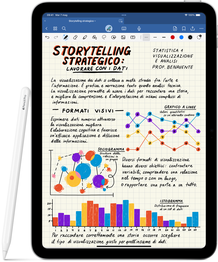 Disegna, prendi appunti, annota un documento. Con Apple Pencil è tutto proprio come dovrebbe essere: intuitivo, facile, quasi magico. Precisa all’ultimo pixel, ha una bassa latenza e cambia il tratto in base all’inclinazione. Mentre la usi puoi appoggiare la mano sullo schermo proprio come faresti su un foglio. Ed è sempre pronta quando arriva l’ispirazione.