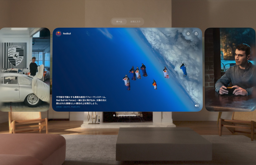visionOSでは、アプリがディスプレイの枠を超えて周囲の空間いっぱいに広がります。好きな位置に動かすことも、完璧なサイズに調整することもできます。部屋の明るさに反応したり、影を投影するのも魅力です。