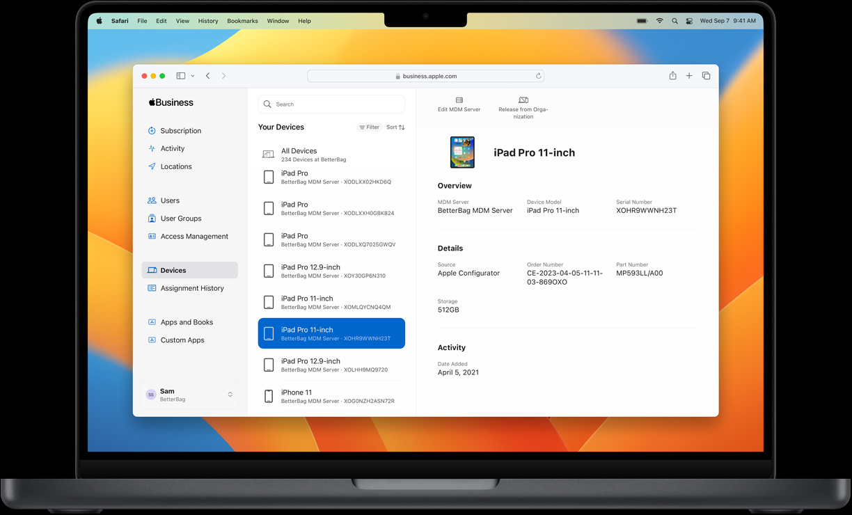 Apple Business Managerは無料で使えるウェブベースのポータルで、IT部門はどこからでも安全にデバイスの設定やアプリの配布ができます。IT部門は、ユーザーの管理対象Apple IDの作成、新しいデバイスの割り当て、アプリの一括購入と配布ができ