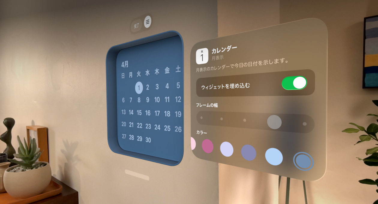 写真、時計、ミュージック、カレンダーなど、お気に入りのウィジェットを一目で確認できる位置に置いておけます。フレームの厚み、色、奥行きをカスタマイズするのも簡単です。Apple Vision Proを装着するたびに、あなたの理想の空間が広がります。