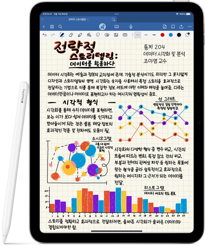 Apple Pencil은 그리고, 메모하고, 문서에 마크업을 다는 행위는 이 정도로 직관적이고 정밀하면서도 사뭇 마법처럼 느껴져야만 한다는 하나의 기준을 제시합니다. 픽셀 단위의 정밀함에 극히 짧은 지연 시간, 기울기 감지 기능, 팜리젝션 기능은 물론, 번뜩 영감이 떠오른 순간 바로 집어 쓸 수 있는 편리한 사용성까지 갖췄죠.