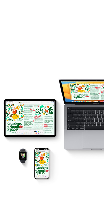 Apple 기기를 넘나들며 작업을 매끄럽게 이어갈 수 있습니다. 한 기기에서 시작한 작업을 다른 기기에서 마무리할 수 있죠. 심지어 ‘연속성 카메라’ 및 ‘유니버설 컨트롤’ 등의 기능을 활용해 여러 기기를 함께 사용할 수도 있답니다.