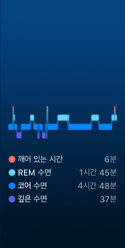 매일매일의 건강 상태를 손목에서 바로 이해할 수 있습니다. Apple Watch를 착용하고 수면을 취하면 평균 심박수, 호흡수, 혈중 산소 농도,2
