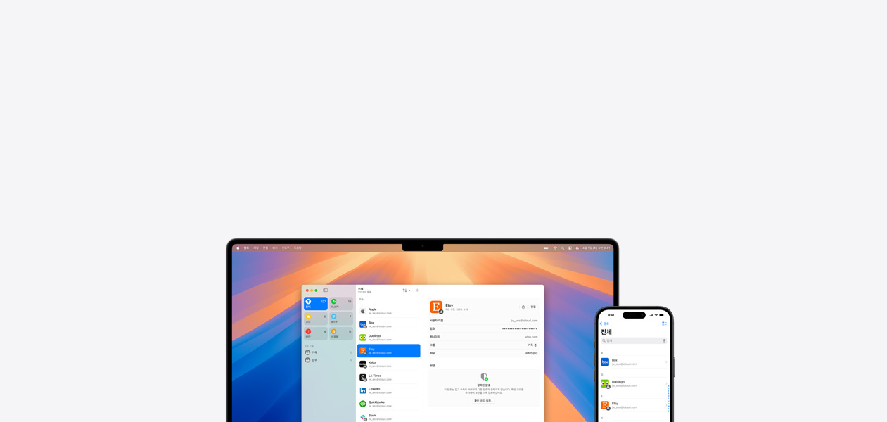 암호와 패스키, 기타 자격 증명을 한곳에서 손쉽게 확인할 수 있습니다. ‘자동 완성’으로 빠르게 로그인하고, 계정이 유출된 경우 알림을 받으며, 이동 중에도 동기화할 수 있죠.