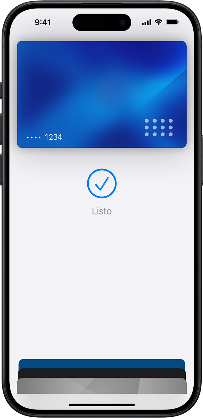 Agregar una tarjeta de crédito o débito es tan fácil como abrir la app Wallet, dar al símbolo más y tocar la parte posterior de tu iPhone con una tarjeta elegible.1 También puedes agregar una tarjeta de forma manual: abre la app Wallet, toca el símbolo más y sigue las instrucciones que aparecen en la pantalla. Tendrás que verificar tu información con el banco o el emisor de la tarjeta. Incluso puedes agregar la tarjeta a tu Apple Watch si lo tienes enlazado. Y cuando cambies de iPhone, puedes transferir tus tarjetas al nuevo dispositivo en un solo paso.