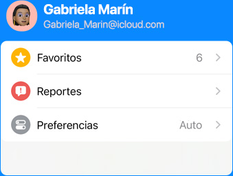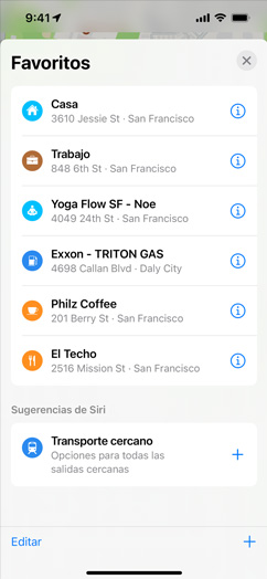 Abre Mapas y toca tu foto de perfil en la parte inferior de la pantalla para ver los ajustes que más usas en un solo lugar, como el tipo de transporte preferido, problemas reportados y tus favoritos. Además, al abrir Mapas en tus dispositivos o en CarPlay, podrás ver los lugares que visitas con más frecuencia, como tu casa, el trabajo, el gimnasio, la escuela de tus hijos, la gasolinera más cercana o tu restaurante favorito, y empezar a recibir indicaciones con sólo un toque.