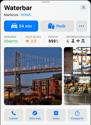Al elegir un destino, la tarjeta interactiva te mostrará al instante todo lo que necesitas saber acerca del lugar, como la dirección, los horarios, el sitio web y el número de teléfono. También puedes consultar detalles como rangos de precios, fotos, métodos de pago aceptados e incluso si puedes llevar a tu perro. Con Flyover, puedes hacerte una idea de la ubicación y los alrededores. Incluso puedes rentar una bicicleta de forma rápida y segura, pagar el estacionamiento, pedir comida y mucho más con sólo un toque.