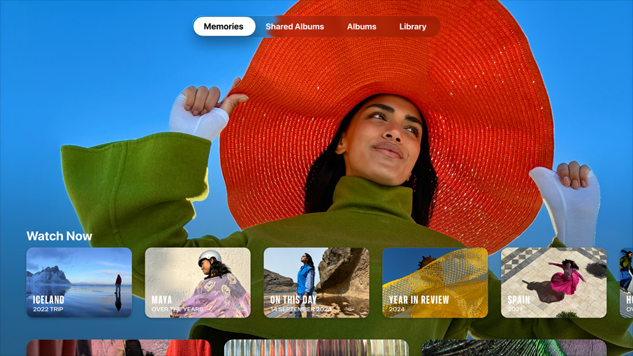 Photos. iCloud Shared Photo Library makes it easier than ever for the whole family to enjoy each other’s photos, and you can see them all on your TV. And you can choose Memories as your screen saver and watch your special moments come alive on the big screen.