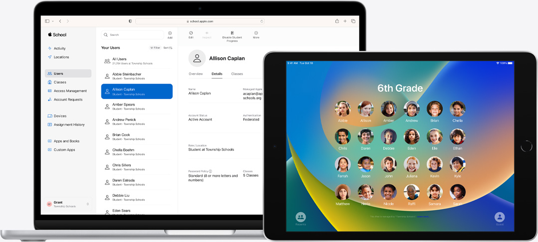 Usługa Apple School Manager pozwala Christopherowi Veljanovskiemu, szkolnemu specjaliście ds. wsparcia technicznego, z łatwością wyposażyć uczniów i nauczycieli dokładnie w to, co im potrzebne. A ponieważ wszyscy dostają swoje szkolne Apple ID, wdrożenie jest niezwykle proste. W apce Klasa nauczyciele mogą rozsyłać plany lekcji i w czasie rzeczywistym monitorować pracę uczniów. A apki Pliki używać do bezpiecznego i poufnego udostępniania zadań.