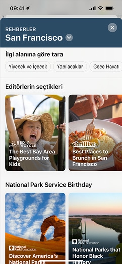 Özel Düzenlenmiş Rehberler, yemek yemek, alışveriş yapmak, arkadaşlarla buluşmak veya sadece keşfetmek için harika yerler bulmanıza yardımcı olmak amacıyla güvenilir iş ortakları tarafından hazırlanan yer listeleridir. Harita’da dünya çapında birçok şehir için 1000’den fazla özel düzenlenmiş rehber sunulmaktadır. iOS 15’te Harita’yı açıp Rehberleri Keşfet’e dokunarak Harita editörlerinin tavsiye ettiği Rehberler'i inceleyebilirsiniz.