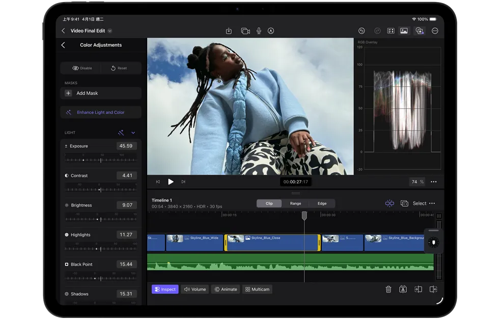 只要一部裝置,就能拍攝、剪輯和分享精彩作品。有了配備光學雷達掃描儀的 Pro 相機系統、錄音室等級麥克風和四個揚聲器,你可以拍攝 4K ProRes 影片、錄製 podcast,還能使用輸入選擇器,為每款 app 挑選合適的麥克風。