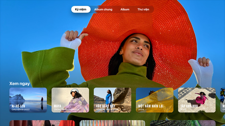 Ảnh. Thư Viện Ảnh Được Chia Sẻ iCloud giúp cả gia đình dễ dàng ngắm nghía các bức ảnh của nhau và bạn có thể xem ảnh ngay trên TV. Bạn cũng có thể chọn Kỷ Niệm làm trình bảo vệ màn hình và xem những khoảnh khắc đặc biệt của mình thật sống động trên màn hình lớn.